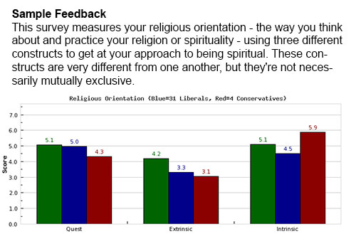 Our aim is to understand how our "spiritual minds" work. By filling out a few of our surveys, you'll help us do just that. In exchange, we will give you an instant report on how you scored on each quiz or survey! We'll show you how your responses compare to others and we'll tell you what that might say about you. By participating in our surveys, you will explore your own spirituality and find out about the spiritual attitudes and religious practices of other people at the same time.